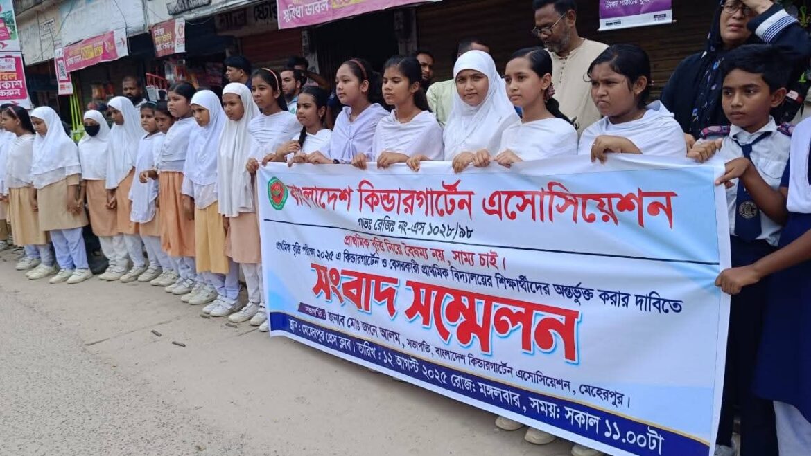 “প্রাথমিক বৃত্তি নিয়ে বৈষম্য নয়, সাম্য চাই”—এই প্রতিপাদ্যকে সামনে রেখে বাংলাদেশ কিন্ডারগার্টেন অ্যাসোসিয়েশন মেহেরপুর জেলা শাখার উদ্যোগে মানববন্ধন অনুষ্ঠিত হয়েছে।