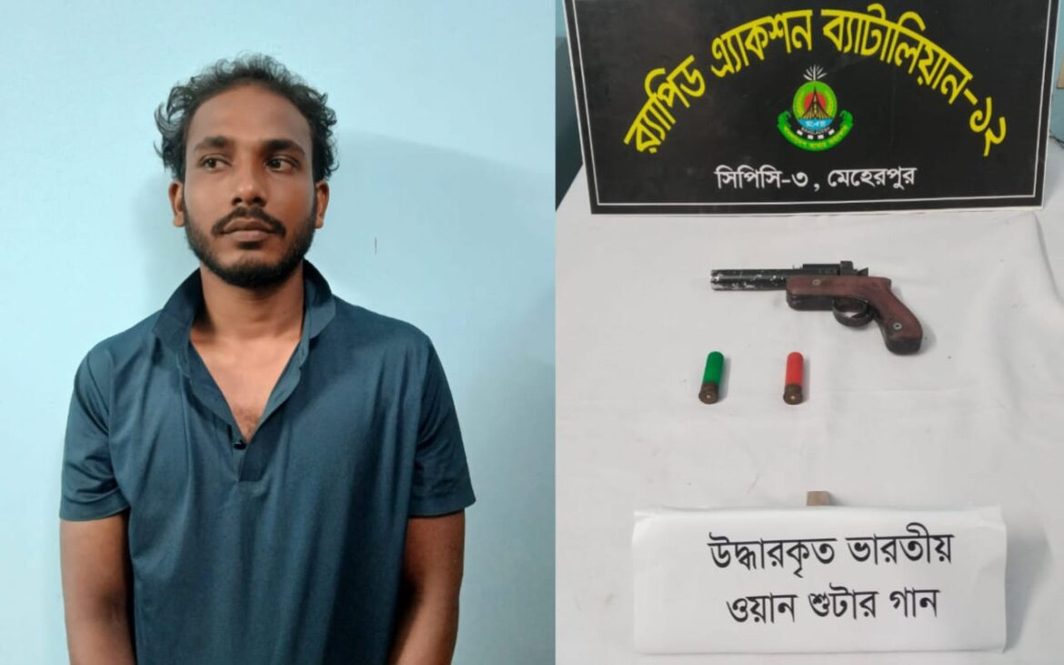 র্যাব সুত্রে যানায়, গোপন সংবাদের ভিত্তিতে বৃহস্পতিবার রাত সাড়ে ৩টার দিকে র্যাব ১২ সিপিসি-৩ মেহেরপুর এর কোম্পানি কমান্ডার লেঃ ওয়াহিদুজ্জামান এর নেতৃত্বে র্যাবের একটি দল ঐ এলাকায় অভিযান চালায়, অভিযানে ওয়ানশুটারগান ও দুই রাউন্ড কার্তুজসহ সুমন আহমেদ নামের ঐ যুবককে তার নিজ বাড়ি থেকে আটক করা হয়। র্যাব যানায়, আসামির বিরুদ্ধে প্রয়োজনীয় আইন প্রয়োগের মাধ্যমে ব্যবস্থা গ্রহণ করা হবে।