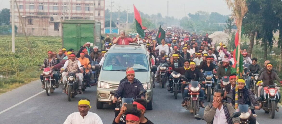 বিএনপির মনোনীত প্রার্থী আমজাদ হোসেন ছাদ খোলা মাইক্রোতে দাঁড়িয়ে সাধারণ মানুষদের হাত নাড়িয়ে অভিবাদন জানান।