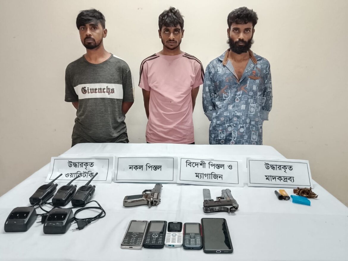 ংযৌথবাহিনীর সূত্র জানায়, সুনির্দিষ্ট গোয়েন্দা তথ্যের ভিত্তিতে মেহেরপুদদদলধআর্মি ক্যাম্পের নেতৃত্বে একটি সাঁড়াশি অভিযান পরিচালনা করা হয়। অভিযানে অস্ত্র, মাদক ও চাঁদাবাজিসহ বিভিন্ন মামলার আসামি আকাশ গ্যাংয়ের সদস্য আকাশ, রায়হান ও সজিবকে আটক করা হয়। এসময় তাদের কাছ থেকে একটি বিদেশি পিস্তল, একটি ম্যাগাজিন, একটি নকল পিস্তল, তিনটি ওয়াকিটকি সেট ও চার্জার, ধো এবং মাদক ব্যবহারের সরঞ্জাম উদ্ধার করা হয়।
