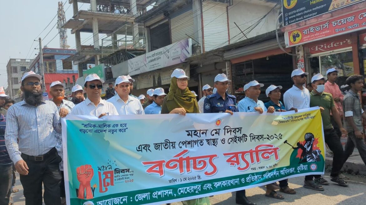 আন্তর্জাতিক শ্রমিক দিবস ২০২৫ উপলক্ষে বৃহস্পতিবার (১ মে) সকালে বর্ণাঢ্য র্যালি ও আলোচনা সভার আয়োজন করা হয়। জেলা প্রশাসনের উদ্যোগে আয়োজিত এই অনুষ্ঠানে প্রধান অতিথি হিসেবে উপস্থিত ছিলেন জেলা প্রশাসক সিফাত মেহনাজ। এই সময় আরো উপস্থিত ছিলেন অতিরিক্ত জেলা প্রশাসক তরিকুল ইসলাম, অতিরিক্ত পুলিশ সুপার সার্কেল আব্দুল করিম, মেহেরপুর সদর উপজেলা নির্বাহী অফিসার খায়রুল ইসলাম,