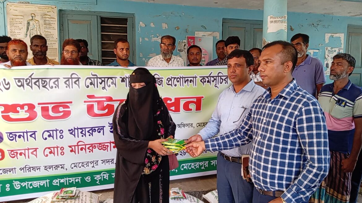 মেহেরপুর সদর উপজেলা ২০২৫-২৬ অর্থবছরের প্রণোদনা কর্মসূচির আওতায় ক্ষুদ্র প্রান্তিক কৃষকের মাঝে বসতবাড়িতে চাষযোগ্য শীতকালীন শাক-সবজির বীজ এবং মাঠে চাষযোগ্য আগাম শীতকালীন শাক-সবজি লাউ,বেগুন, মিষ্টি কুমড়া, শসা ফসলের বীজ ও রাসায়নিক সার বিতরণ করা হয়।