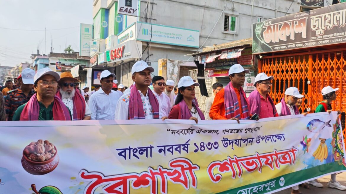 মেহেরপুর জেলা প্রশাসনের উদ্যোগে বর্ণাঢ্য আয়োজনের মধ্য দিয়ে বাংলা নববর্ষ ১৪৩৩ উদযাপন করা হয়েছে। এ উপলক্ষে মঙ্গলবার সকালে জেলা প্রশাসকের কার্যালয় চত্বর থেকে একটি আনন্দঘন র্যালি বের করা হয়।