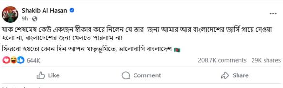 সাকিব লেখেন, ‘যাক শেষমেশ কেউ একজন স্বীকার করে নিলেন যে তার জন্য আমার আর বাংলাদেশের জার্সি গায়ে দেয়া হলো না, বাংলাদেশের জন্য খেলতে পারলাম না! ফিরব হয়তো কোনো দিন আপন মাতৃভূমিতে, ভালোবাসি বাংলাদেশ।