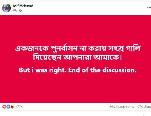 মূলত, সাকিব আল হাসানের পোস্টের কিছুক্ষণ পর একটি পোস্ট করেন যুব ও ক্রীড়া উপদেষ্টা আসিফ মাহমুদ। লেখেন, ‘একজনকে পুনর্বাসন না করায় সহস্র গালি দিয়েছেন আপনারা আমাকে। কিন্তু, আমিই ঠিক ছিলাম। আলোচনা শেষ।’ সেই পোস্টের কমেন্ট বক্সে বেশিরভাগ নেটিজেনদের মন্তব্যে সাকিবের প্রতি ক্ষোভ ও বিরক্তি প্রকাশ করতে দেখা গেছে।